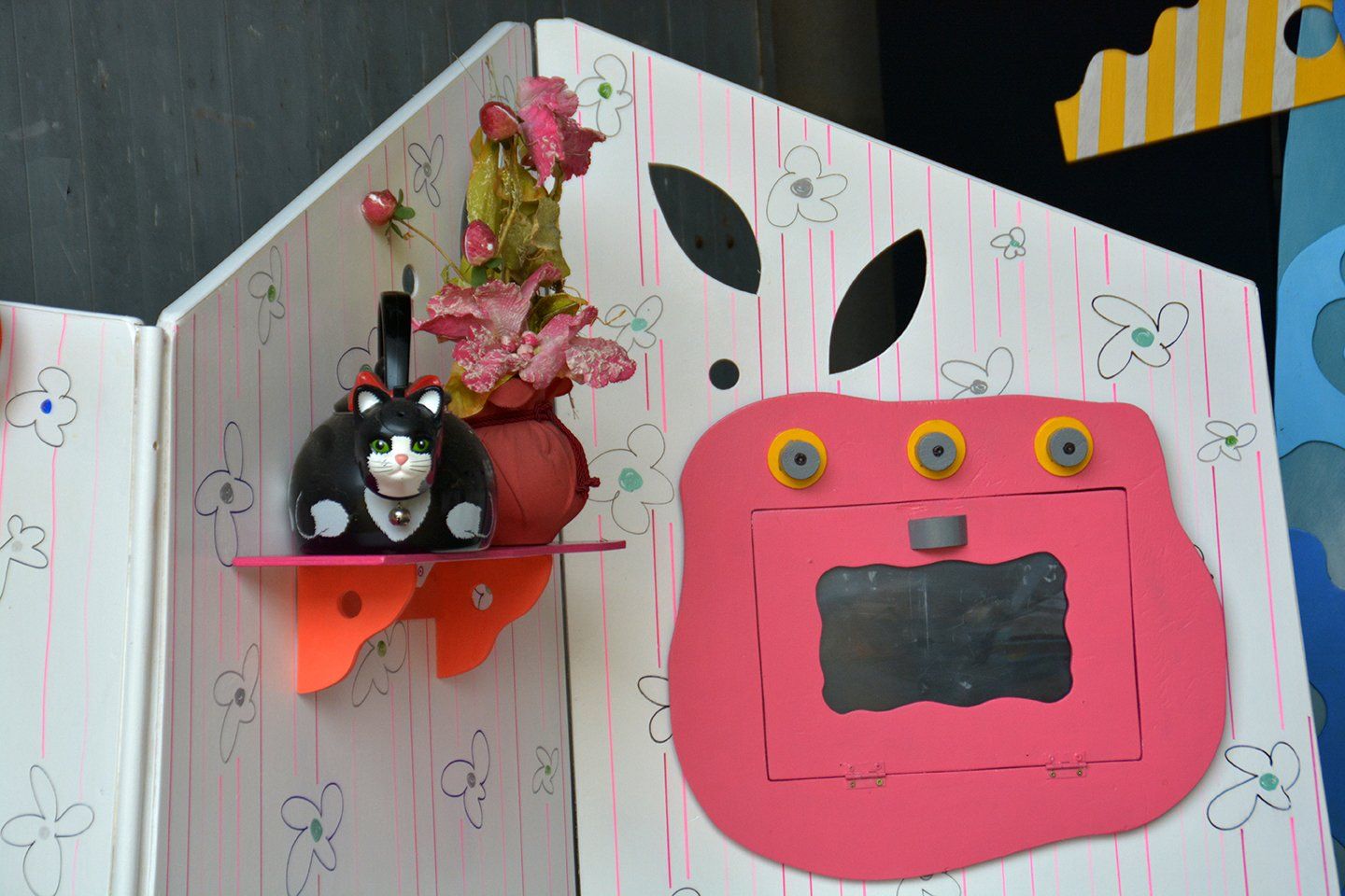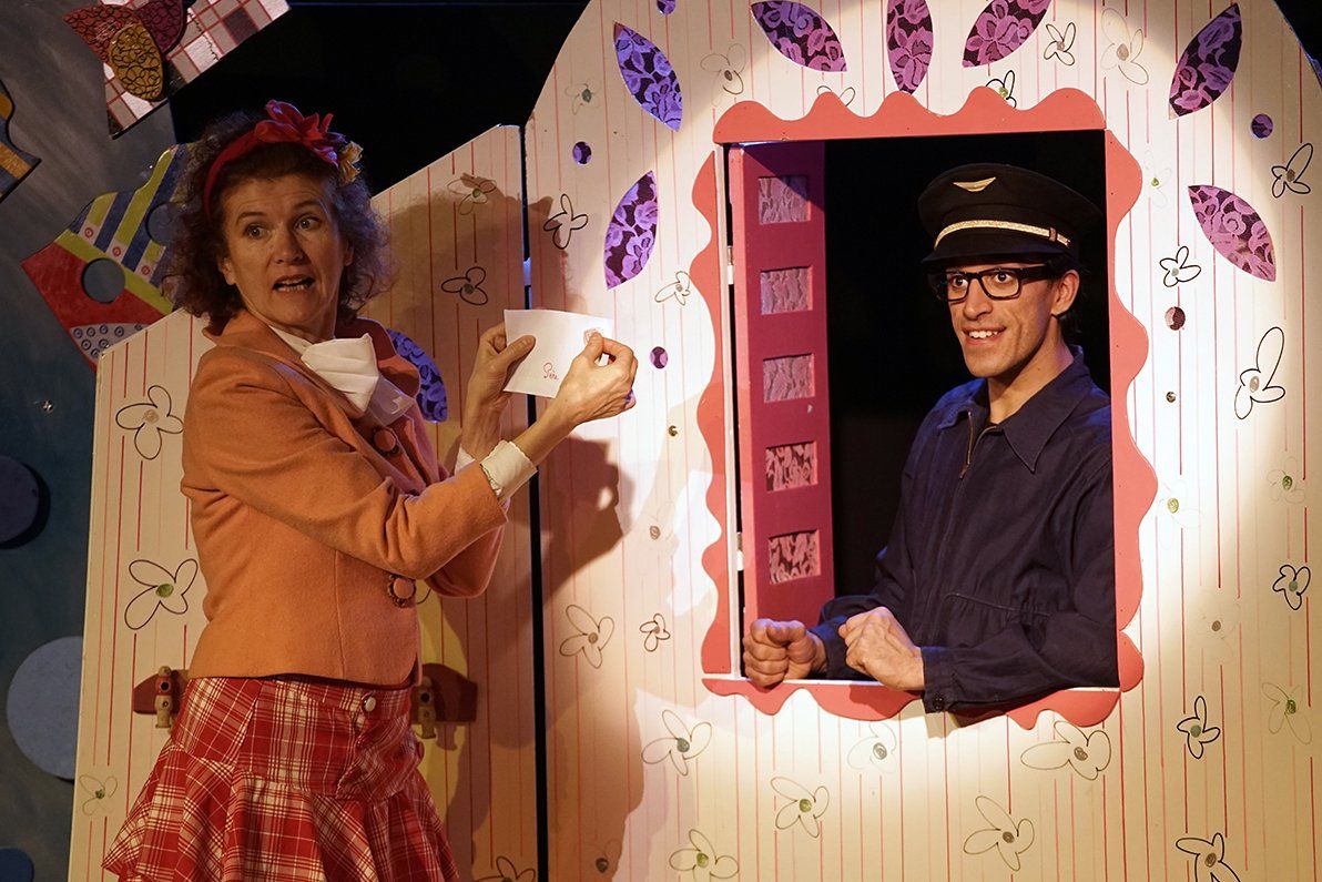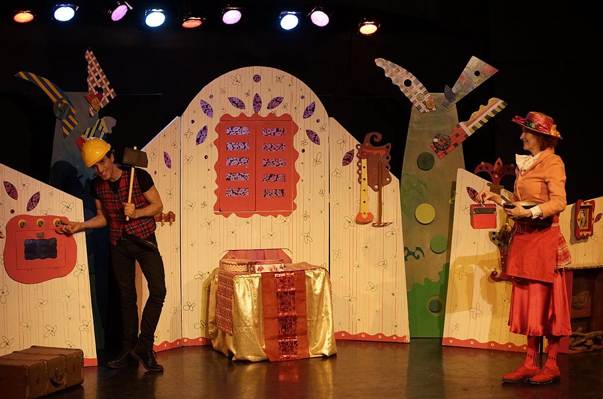 Deux comédiens et des marionnettes évoluent dans un décor coloré, au rythme des histoires et