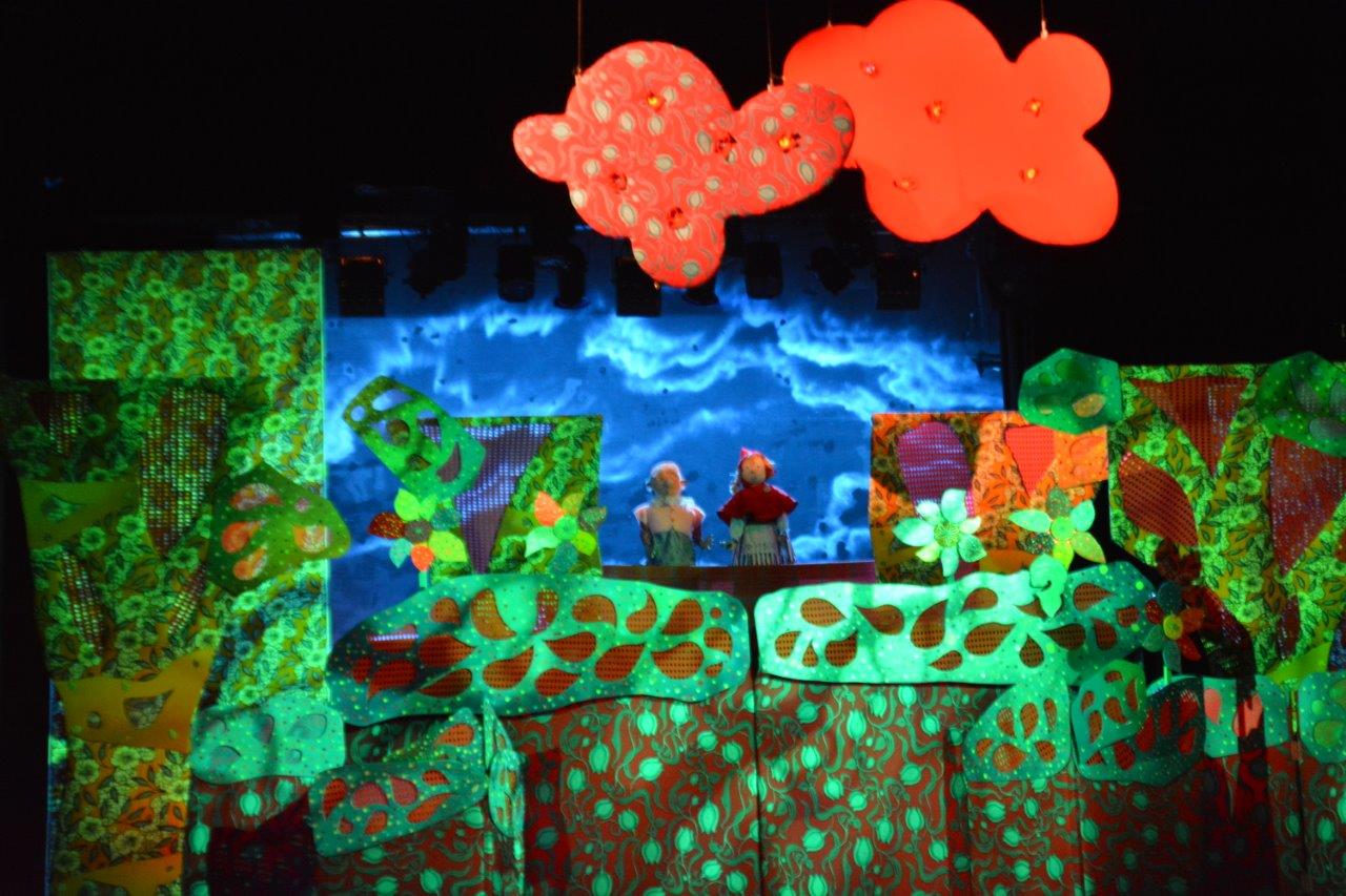Deux comédiens et des marionnettes évoluent dans un décor coloré au rythme des chansons originales.